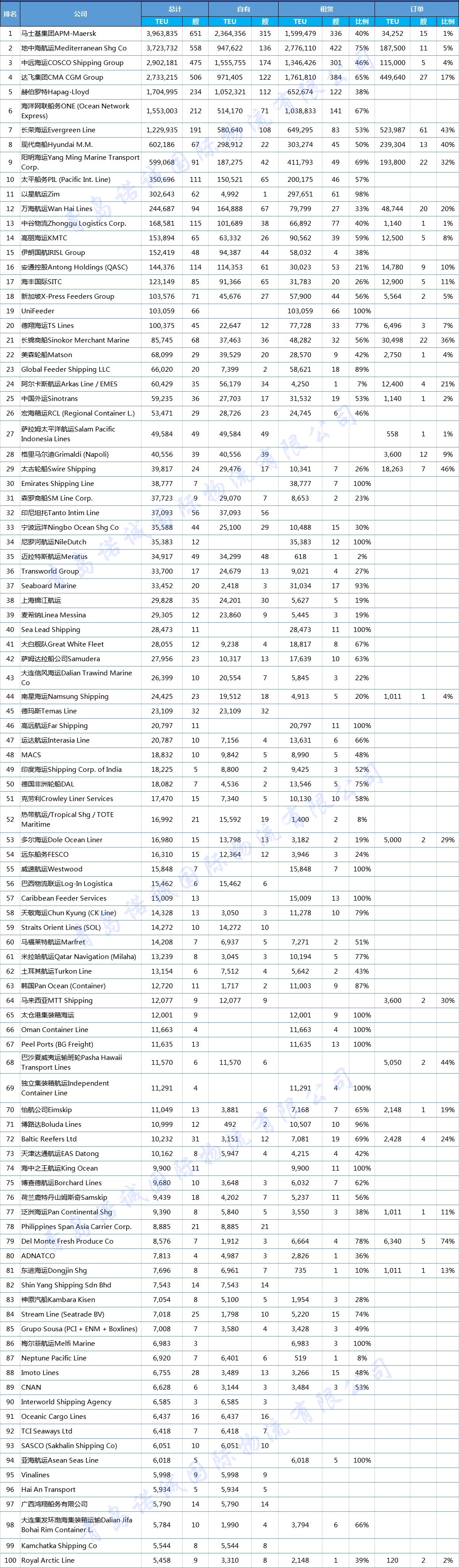 船公司運力百強名單(截至20200703)
